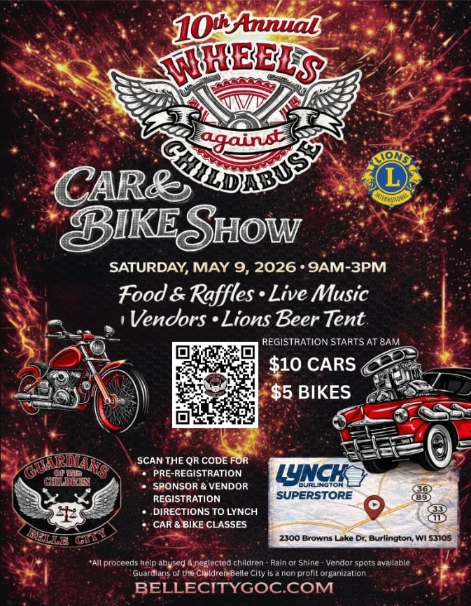 Guardians of The Children Belle City’s 10th Annual Wheels Against Child Abuse Fundraiser Classic Car & Bike Show is back at Lynch Chevrolet in Burlington, WI! All cars are welcome to participate.