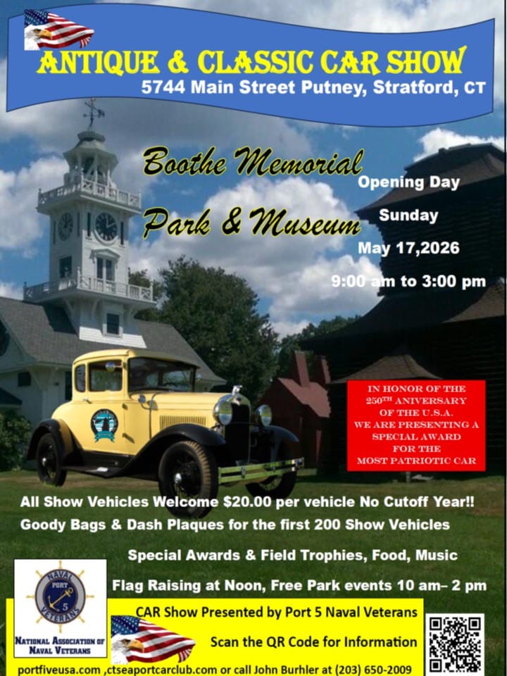 In honor of America’s 250th Anniversary, we’re presenting a special award for the most patriotic car. Don’t miss the flag raising ceremony at noon, performed by the Port 5 Color Guard.