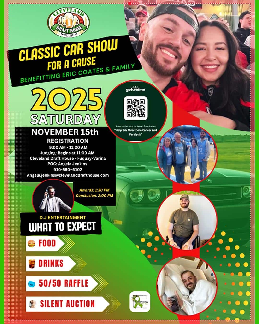 Fundraiser car show to help the Eric Coates and family with their Cancer treatment costs. 1999 older vehicles welcome to register day of event between 9 and 11am. Show start at 11am. Awards at 1:30pm. Various awards. $20.00 registration includes lunch and chance for grand prize. Music, raffles and 50/50. Free to attend. 75 vehicle limit to show parking.