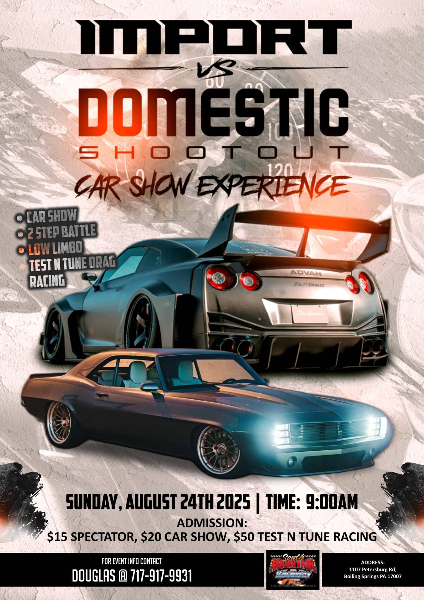 SUNDAY 8/24! ⚠️ Calling the Top Import and Domestic cars in the Tre-State area! The hottest cars will be at South Mountain Raceway on Sunday 8/24! Your chance to ENTER THE CAR SHOW and RACE 🏁 your car LEGALLY on a drag strip is here‼️ It’s time to call out your friends, your dad, neighbors!! Who’s got the fastest ride?? or is it who knows how to handle their ride better. Either way, it’s your chance to have a great time‼️ Low limbo, 2-Step Exhaust Battle, and much more!