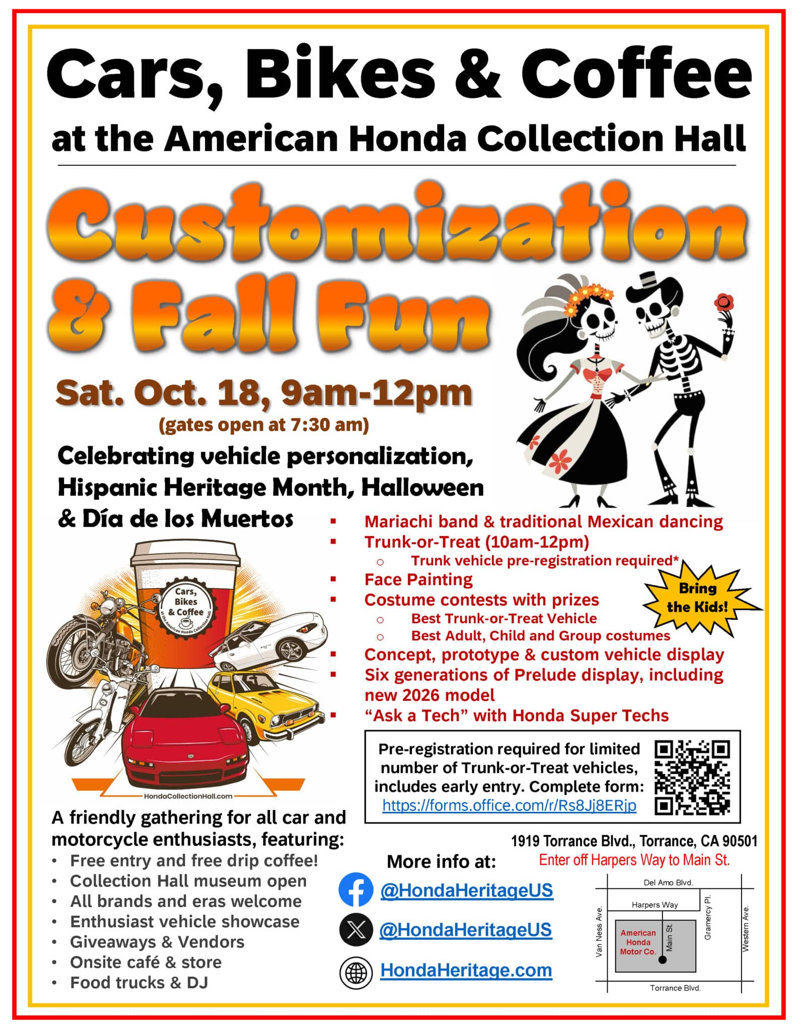 Join thousands of fellow car and motorcycle enthusiasts at the “Customization & Fall Fun” themed Cars, Bikes & Coffee Show on Saturday, October 18 in Torrance, CA at 1919 Torrance Blvd.