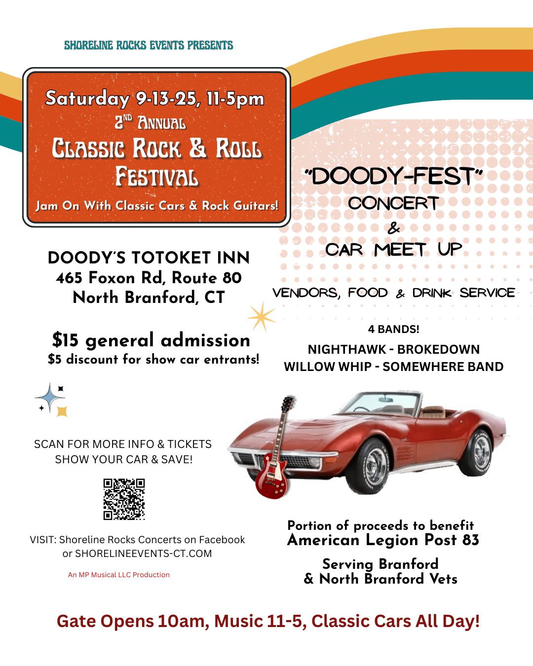 CLASSIC CARS & ROCK GUITARS! Shoreline Rocks Concerts presents our 2nd Annual Classic Rock & Roll Festival on Saturday 9/13 (rain date 9/14) at Doody’s Totoket Inn. This event features 4 popular local bands and a Classic Car Meetup, along with various vendors offering their goods. Parking available on grass or blacktop, show cars get priority placement for a view of the stage. Breakfast sandwiches & coffee service begins at 10am.