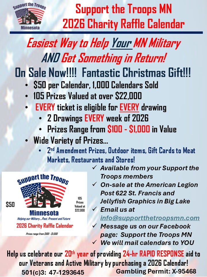 Ride is open at all Motorcycles, Trikes, Classic cars, Exotics and Muscle cars. The ride will have 3 stops along the way and includes a post party with food, live music, raffles and much more! All proceeds go to support Minnesota Veterans and Active Military personnel in the state of Minnesota. Support the Troops MN is a non-profit, all volunteer, 501c (3) organization providing a Rapid Response to the Veterans and Military Members with emergency financial needs for the last 20 years.