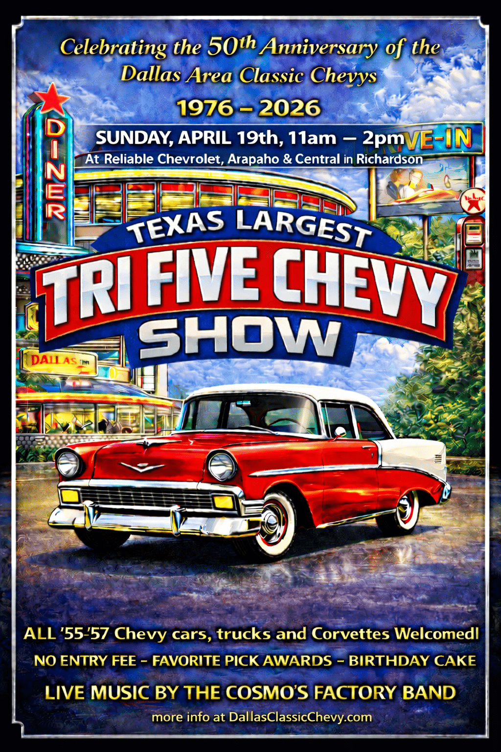 Join us for Texas’ largest exclusive ’55-’57 Chevy car, truck, and Corvette show! This year marks a special milestone as we celebrate the Dallas Area Classic Chevys’ 50th Anniversary.