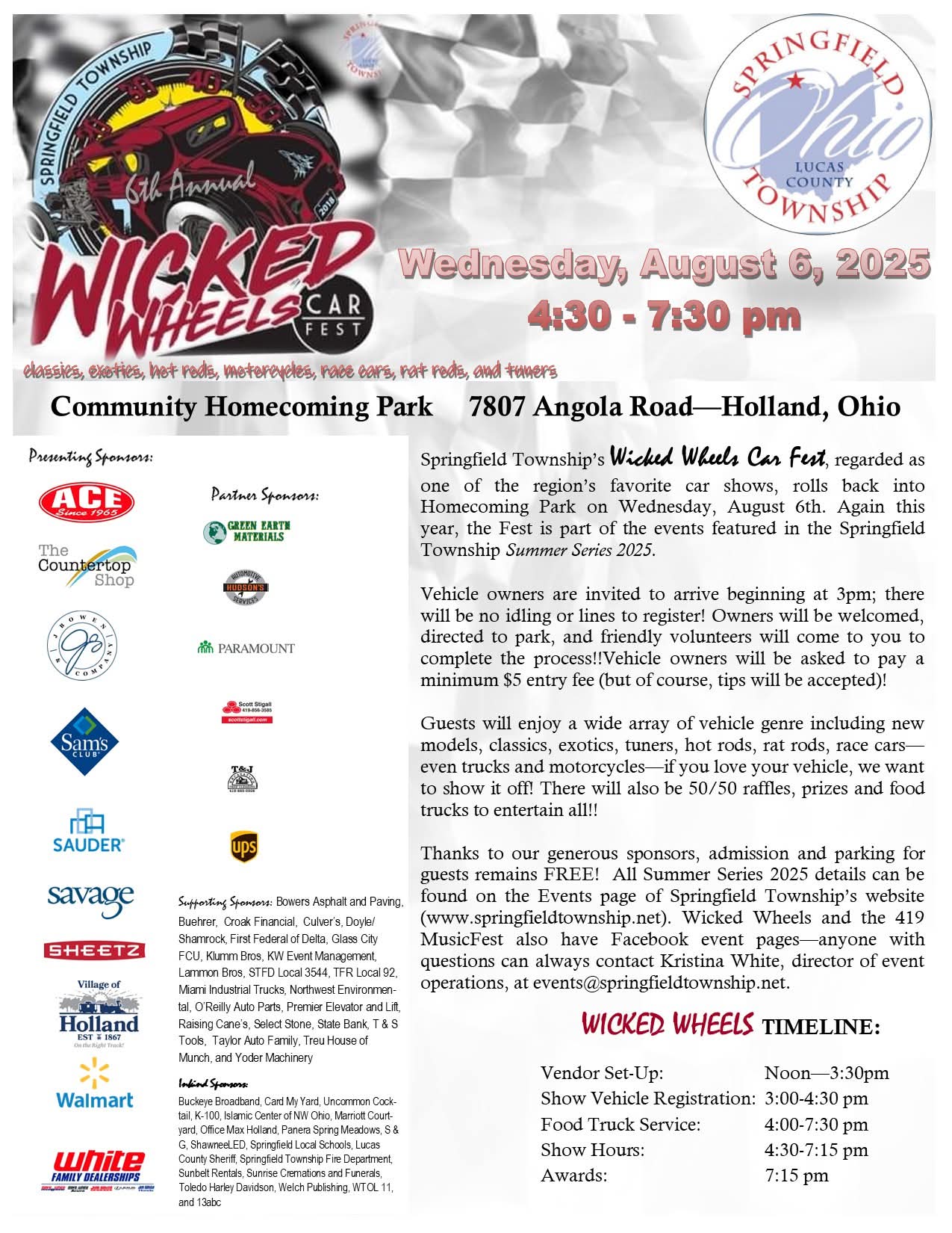 Bring your Classics, Exotics, Hot Rods, Motorcycles, Race Cars, Rat Rods, Tuners, and all other beloved rides to Springfield Township’s Homecoming Park on August 6th. Show vehicles arrive starting at 3 ($5 on site registration- pull into yoyr space and the volunteers come to you). Show hours are 4:30-6:30 – vendor displays, 50/50 and other raffles, prizes, music, food trucks and category judging winners announced at 7! Come get a little wicked on a warm, summer Wednesday